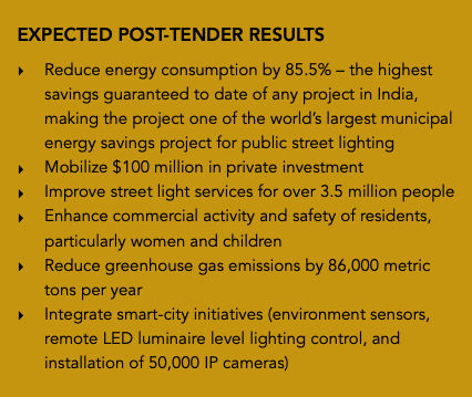 According to the project’s funders, the International Finance Corporation, the city’s lights are currently costing $34.5 million in electricity charges every year. With this project, 510 million units will be saved per year. According to IFC, the services will also be improved with the setting up of a “control-centre based remote operation, real-time monitoring and predictive repair, complaint management through a centralised call centre, and adequate field crews to minimise downtime”. In addition, the street lighting infrastructure will be integrated with smart-city technologies by creating a communication hub to individually manage the LED streetlights and operate 50,000 internet protocol (IP) cameras to transmit images to government agencies. The project is to be implemented in five phases over 30 months where the BBMP is to shell out $33 million every year for a fully-functioning system.